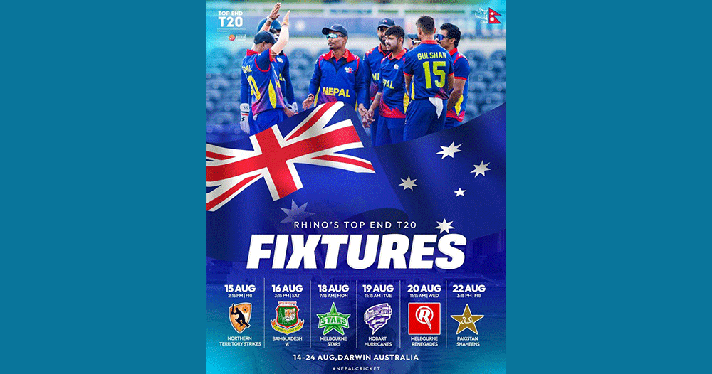 प्रतियोगितामा नेपालले पहिलो खेल (भोली) अगस्ट १५ मा नर्दर्न टेरिटोरी स्ट्राइकरसँग खेल्नेछ । त्यसपछि नेपालले बंगलादेश ‘ए’ १६ अगस्टमा, मेलबर्न स्टार्स १८ अगस्टमा, होबर्ट हुरिकेन्स १९ अगस्टमा, २० मा मेलबर्नसँग २० अगस्ट र पाकिस्तान साहिन्सासँग २२ अगस्टमा खेल्नेछ ।